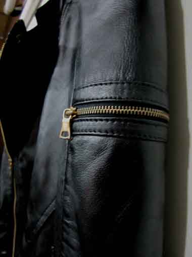 Concealed padding at shoulders. Two zip pockets on sleeves. Zips at cuffs. Double zip front closure. Appliqué detailing at sides.