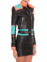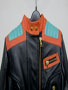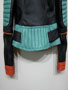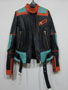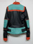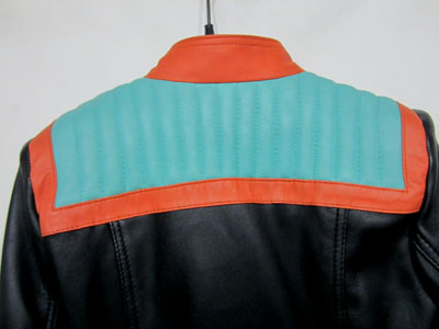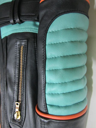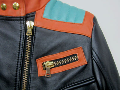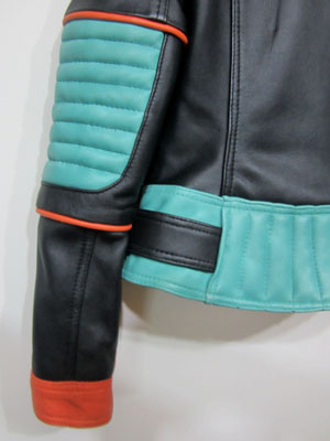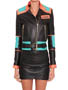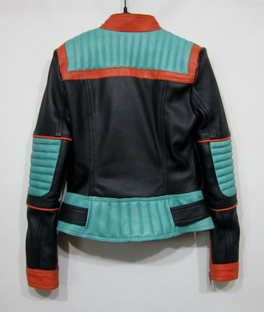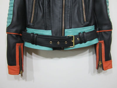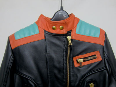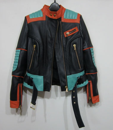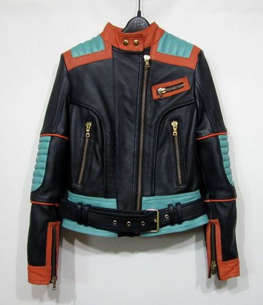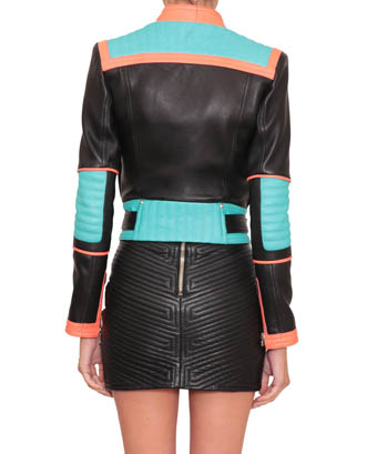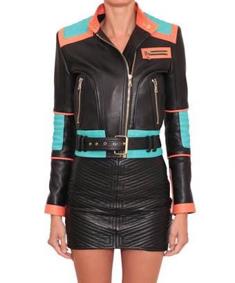 Balmain spring/summer 2015 black nappa leather jacket with multi-colored outlines, three small front zipped pockets and biker details. Zipped cuffs. Off-centered zip closure. Composition: 100% lamb leather