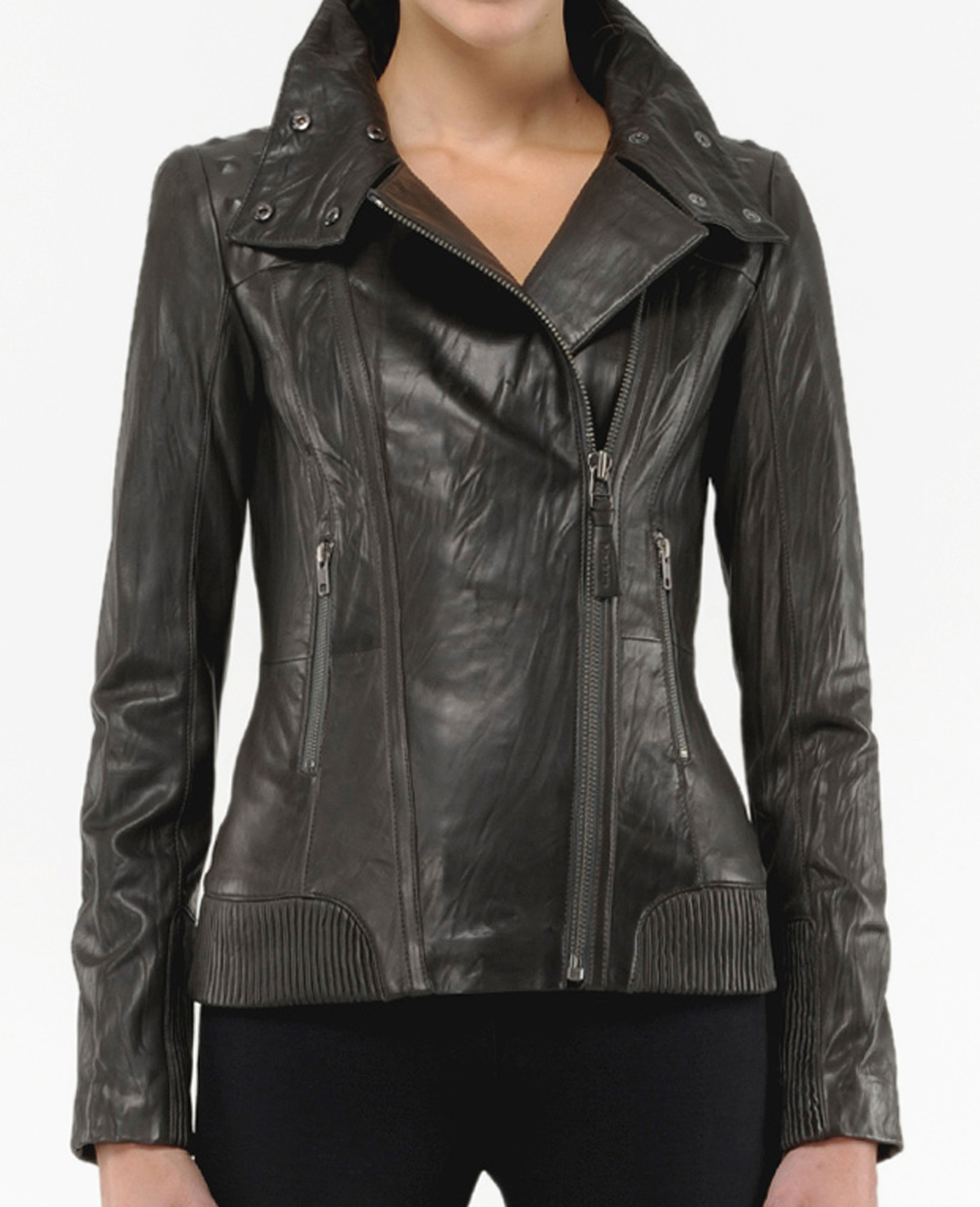 Mackage Jacket in Black, Brown or Grey made in 100% washed Lamskin leather, this reproduction jacket features amazingly structured and detailed jacket. features elastic leather on the waist and sleeves, front asymmtricl zipper, 2 side zipper pockets, tabs on the shoulders, very slim fit through the body and sleeves, the jacket is made in very soft aniline drum washed leather.